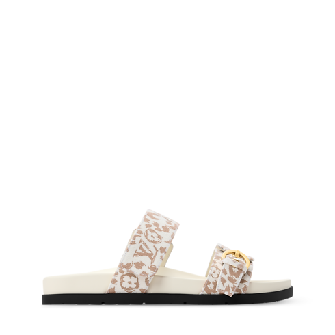 يعود صندل Bom Dia المريح في حلةٍ متجددة بقماش مزدان بنقشة Monogram وطبعة Leopard، التي تُعد سمةً رئيسية لهذا الموسم. يتميز هذا الموديل بحزامين قابلين للتعديل: يُغلق أحدهما بإبزيم ذي لون ذهبي، والآخر، الذي يحمل توقيع LV Initials، بشريط فيلكرو. وتكتمل روعة التصميم بنعل داخلي مريح مصمم ليلائم شكل القدم، ونعل خارجي مطاطي مرن.