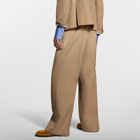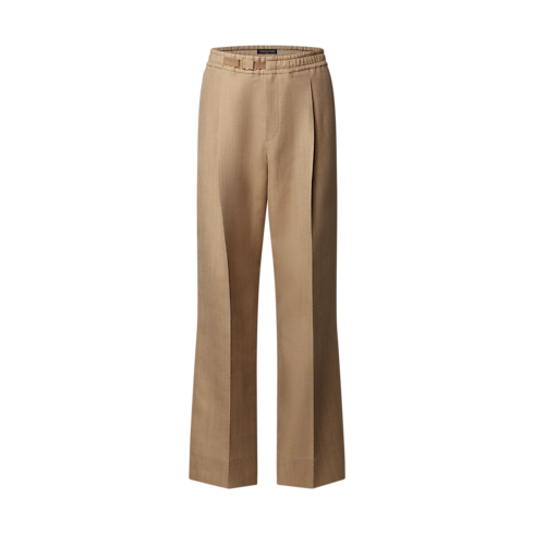 يتميز هذا البنطال المصنوع من الصوف والحرير باللون البيج camel بقصة منسدلة فاخرة بفضل طياته الأمامية وخصره المرن. وتضيف التفاصيل الإبداعية لمسة رياضية من خلال مشبك مستوحى من فكرة تسلق الجبال السائدة في هذه المجموعة، بينما يزين تطريز بتوقيع العلامة الجيب الخلفي بشكل متقن. يُعد هذا البنطال مثالياً للمسة من الأناقة العصرية الراقية على إطلالات الموسم، كما يشكل بدلة معاصرة عند تنسيقه مع سترة متطابقة.