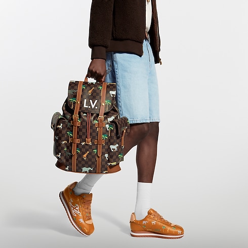 تتميز حقيبة الظهر Christopher MM المتينة بتصميمها المصنوع من قماش Damier Heritage المطلي، والمزيّن بطبعة لحيوانات برية تنطلق بين أشجار النخيل ضمن مجموعة The Darjeeling Limited. ويضفي التقليم الجلدي البني لمسة راقية على درجات الألوان الداكنة، بينما تتألق الأحرف الأولى L.V. باللون الأبيض الجريء على الجزء المتدلي، في إشارة أنيقة إلى حقائب لويس فويتون الأيقونية في الفيلم.
