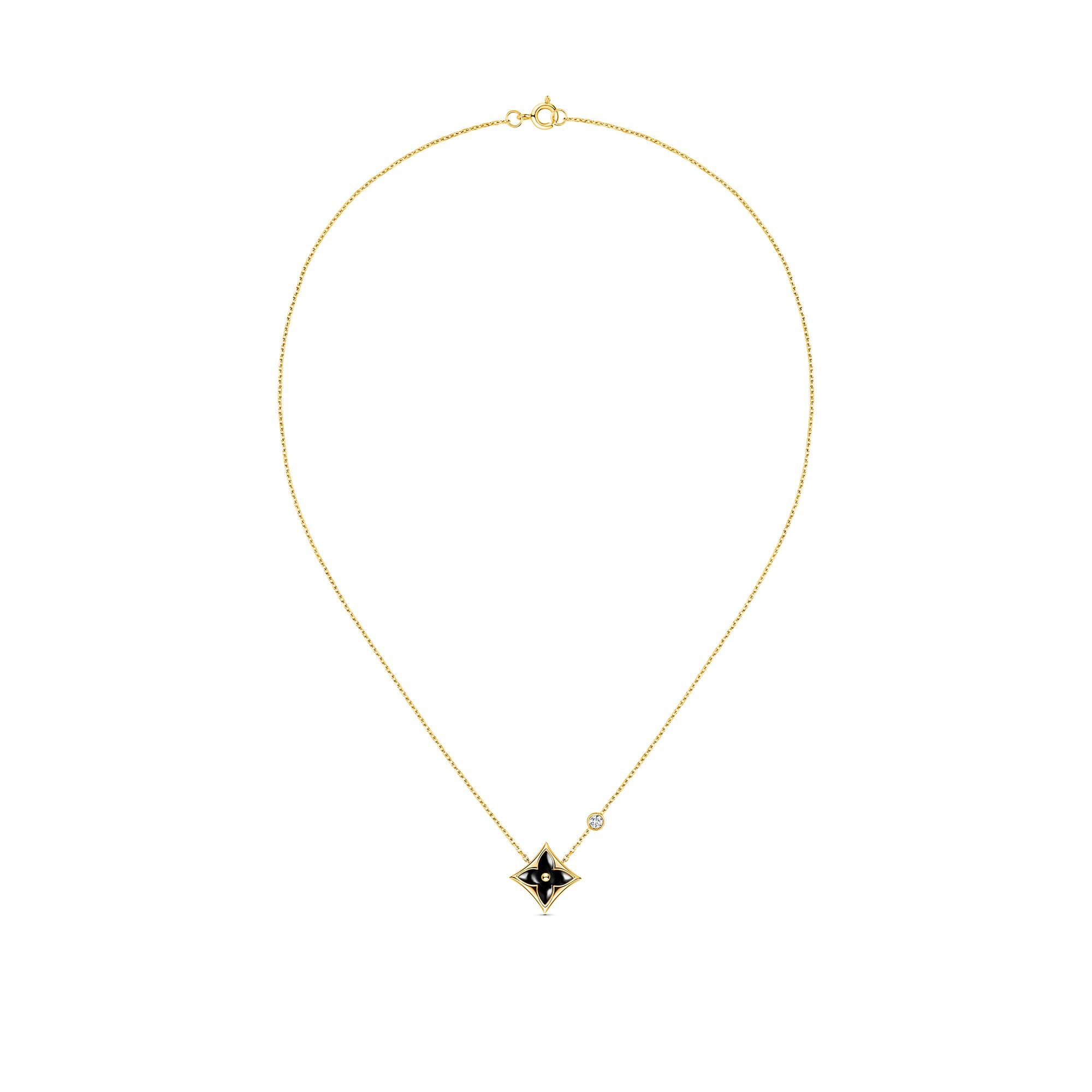 تشيد قلادة Colour Blossom BB Star بالذهب الأصفر والعقيق والألماس بزهرة Monogram، التي صممها Georges-Louis Vuitton في عام 1896. تم نحت العقيق اليماني الراقي لتشكيل بتلات النقشة الخالدة والمصقولة يدويًا للحصول على أقصى لمعان. تضمن التباينات الطبيعية في لون الحجر أن كل عنصر في هذه المجموعة هو حقًا واحد لا ثاني له. صُنعت الدلاية من الذهب الأصفر من عيار 18 قيراطًا وطُعمت بماسة ثمينة، وتتدلى القطعة من سلسلة رفيعة.