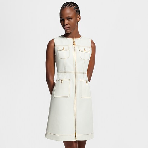 يتميز هذا الفستان بقصة على شكل الحرف A، ويأتي بتصميم راقٍ متقن مصنوع من قطن الجبردين، مع لمسات خياطة بارزة متباينة تبرز القصّة. صُمم الجزء العلوي ليناسب القوام بأناقة، بينما تتسع التنورة لتمنح إطلالة متوسطة الطول محددة بوضوح. وتضيف أربعة جيوب مزودة بأزرار وسحاب مزدوج بكامل الطول لمسة عصرية وعملية بأسلوب فاخر.