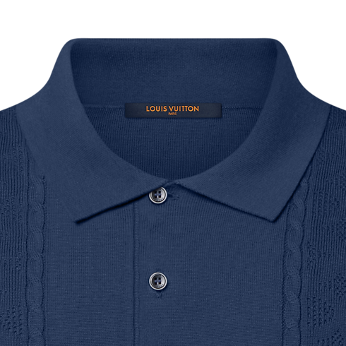 حيك قميص البولو ذو الأكمام القصيرة واللون الأزرق الداكن من خيوط القطن والحرير الفاخرة، ويأتي مزدانًا بحياكة بوينتيل المسامية في الجزء الأمامي، مع تفاصيل زخرفية تشمل توقيعات Monogram وDamier الرقيقة. ويزدان الجزء السفلي من الحاشية اليسرى بتطريزٍ متناغمٍ يحمل توقيع الدار، بينما تبرز شارة جلدية تحمل شعار LV على الظهر. وتُعد هذه القطعة المريحة، التي تتميز بنعومتها ومساميتها للأيام الأكثر دفئًا، خيارًا مثاليًا للارتداء كطبقة إضافية تضيف لمسة preppy شبابية على الإطلالات الرسمية.