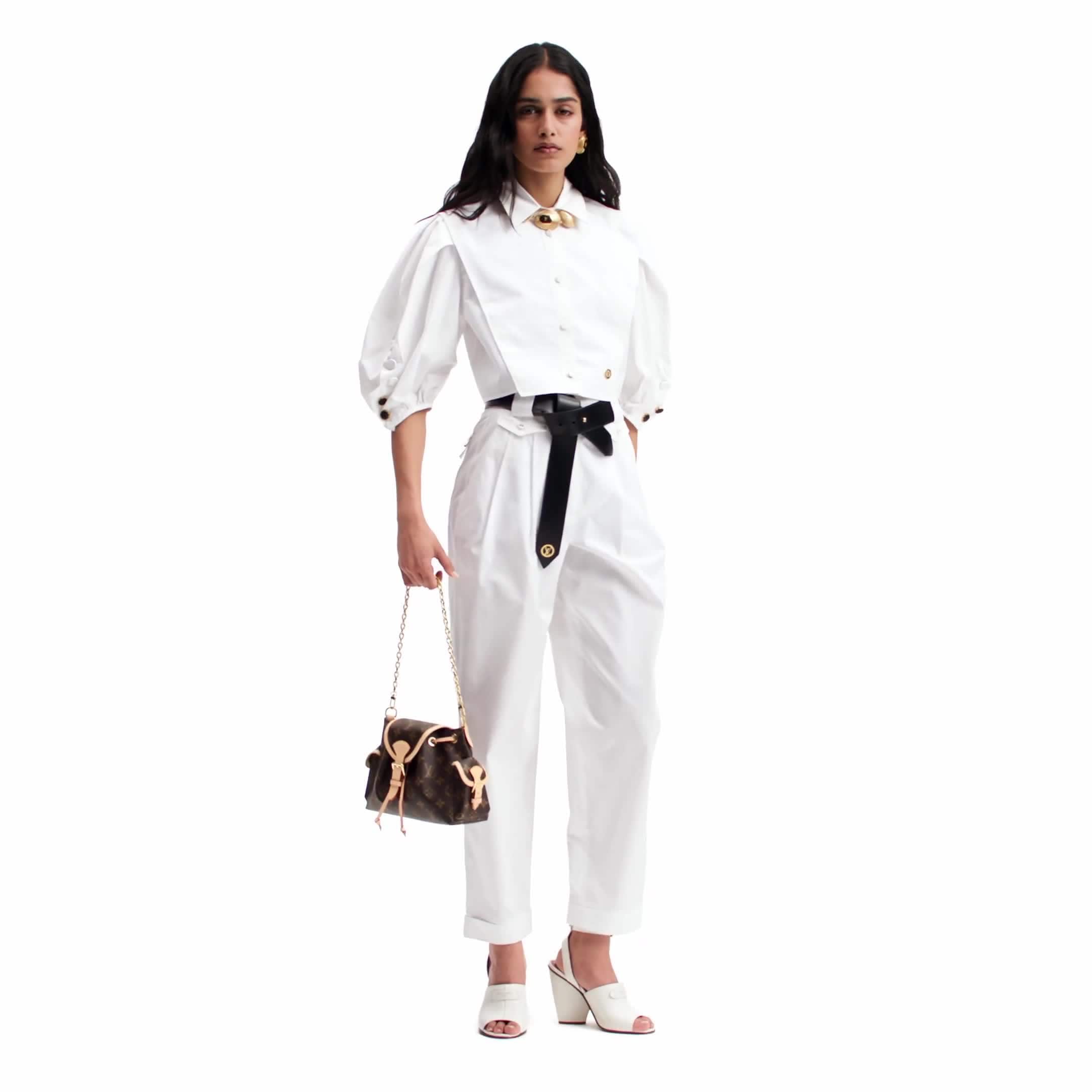 يتميز هذا البنطال بطابع صيفي نابض بالحياة بفضل قطن البوبلين الخفيف المصمم على شكل أرجل واسعة كبيرة، والتي تظهر أكثر مع الطيات المزودة أسفل الخصر. يساهم شريط الخصر العريض المرتفع في إظهار جاذبية الجسم، بينما يُضيف الجيبان الصغيران بالغطاء لمسة بارزة على الإطلالة. ولمزيد من الأناقة، يعكس الزر المطرز المزود بحواف ذهبية اللون لمسات راقية على الإغلاق.