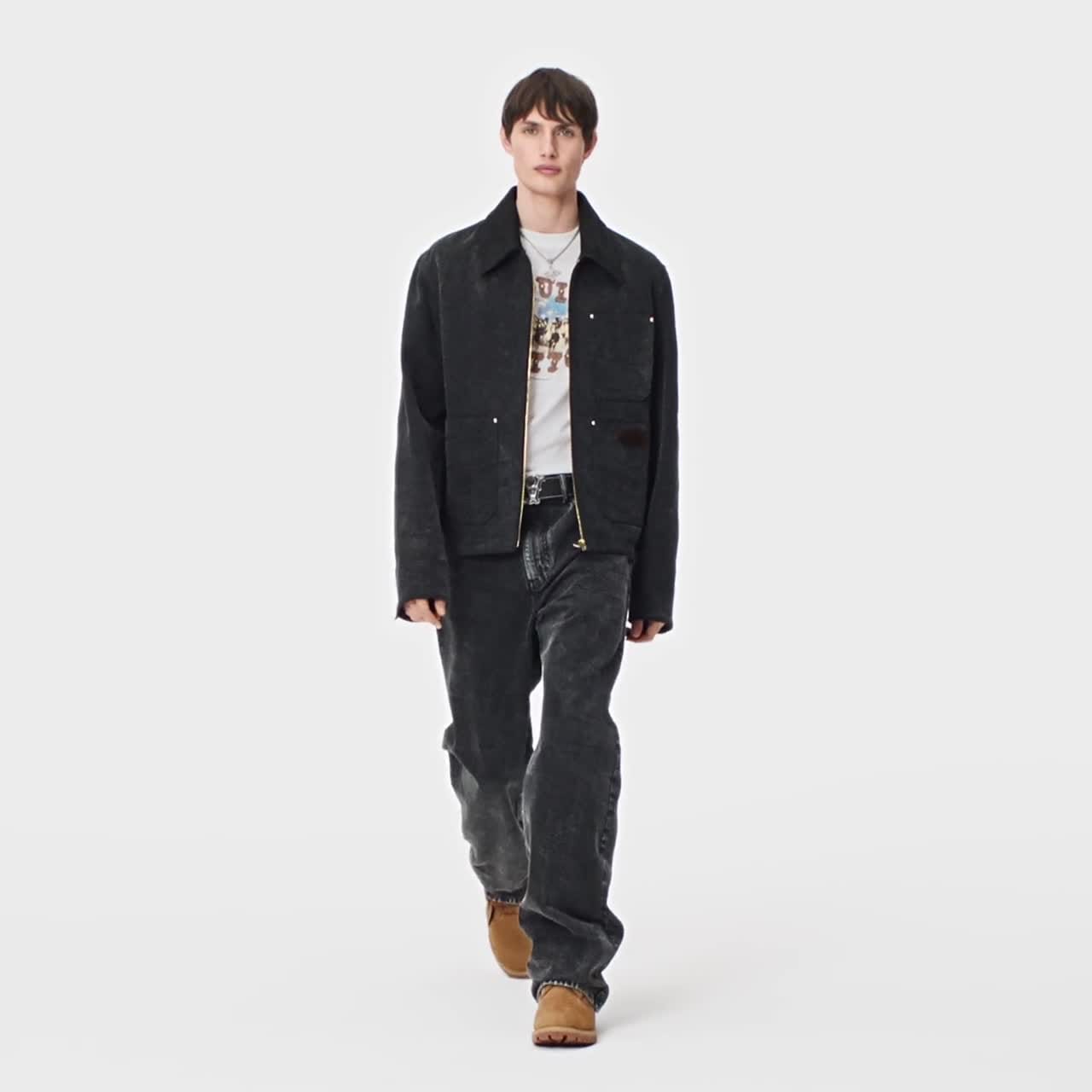 صُنعت هذه السترة من الدنيم المغسول غير المبطن ما يجعلها قطعة خفيفة ومناسبة لكل المواسم. وتندرج السترة ضمن فكرة ملابس العمل الأمريكية التي كانت محور عرض خريف وشتاء 2024، ويزدان تصميمها بقماش من جاكار Damier يحمل توقيعات "Marque L.Vuitton déposée"، وشارة LV Saddle من الجلد على أحد الجيوب، وياقة نوبوك بنقشة Epi. وتمنحها الأزرار الفيروزية على أساور الأكمام لمسة نهائية أنيقة.