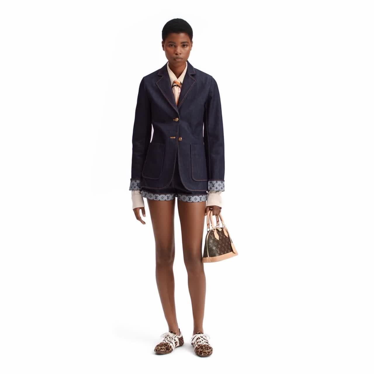أُعيد تصميم هذا البليزر الكلاسيكي الأنيق، بأسلوب كاجوال عصري مرح. حيث صُنعت هذه القطعة من قماش الدنيم الداكن الرائج لهذا الموسم، وتتميز بتصميم ضيّق أنيق، مع ياقة مدببة، وجيبين كبيرين أسفل الخصر، وأزرار ذهبية لامعة. وتتجسد اللمسة النهائية للتصميم في نقشة Monogram الأيقونية على ظهر أساور الأكمام المطوية.