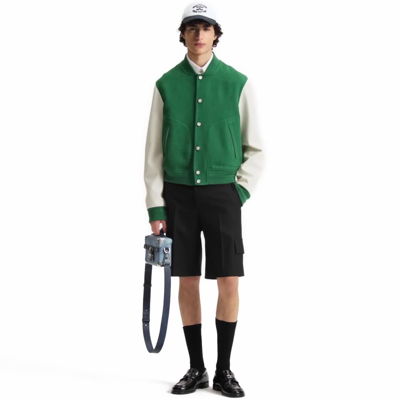 يأتي الجاكيت الرياضي الكلاسيكي بشكل جديد وموديل بسيط وراقٍ أيضًا يناسب الطقس الدافئ. وهو خفيف الوزن، مصنوع من الصوف بدون بطانة، ويزدان بجاكار باللون الأخضر مزين بالكامل بنقشة Monogram رقيقة، وله أكمام متباينة من جلد العجل المحبب باللون الأبيض. ويزدان من الخلف بملصق منسوج يحمل توقيع Marque L.Vuitton Déposée ، وله أزرار كبسونة على شكل لآلئ تضيف لمسة نهائية أنيقة.