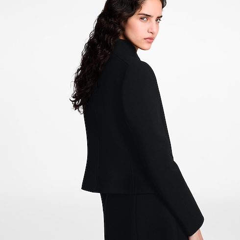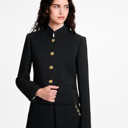 يتألق هذا الجاكيت بطراز جاكيت الضابط وتصميم Nicolas Ghesquière النموذجي، فقد صُنع من كريب صوف مزدوج بقصة أنيقة ضيقة، مع ياقة مرفوعة وجيبين جانبيين بحواف منمقة. ويزدان الجاكيت بأزرار ذهبية منقوشة بحرفي LV تُضيف لمسة مميزة راقية عند إغلاقها من الأمام، في حين بُطن الجزء الداخلي بحرير يحمل نقشة Monogram الكلاسيكية.
