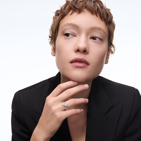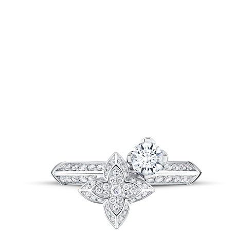 يُبرز خاتم LV Diamonds المزدوج بقَطع Brilliant المستدير خبرة الدار الاستثنائية في صياغة المجوهرات. صُنع الخاتم من الذهب الأبيض عيار 18 قيراطًا، وتتوسطه نجمة LV Monogram مرصعة بالألماس المرصوف لتسلط الضوء على الحجر المركزي بقطع Brilliant المستدير. ولإضافة لمسة توقيع مميزة، صُممت قاعدة الحجر المركزي لتحاكي الزهور المنمقة التي تميز نمط Monogram الأسطوري من دار لويس فويتون، بينما تضيف حبات الألماس البراقة على حلقة الخاتم لمسة نهائية مفعمة بالإشراق. يتميز الخاتم بتصميمه المرح وسهولة تنسيقه، مما يجعله هدية لا تُنسى تُقتنى إلى الأبد.