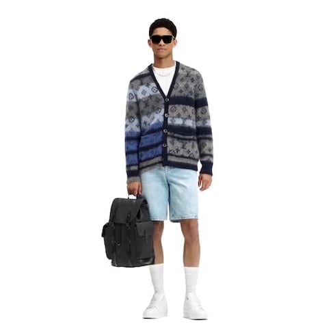 يتوفر هذا الكارديجان المميز والدافئ بدرجات الأزرق الأنيقة مع نقشة Monogram سوداء جرافيكية تشمله بالكامل. صُنع الكارديجان من موهير ناعم الملمس ويمنح إحساساً فخمًا. تضيف هذه الطبقة الدافئة لمسة ملفتة لإطلالة صالحة لكل الأوقات مع بنطال غير رسمي أو رسمي.