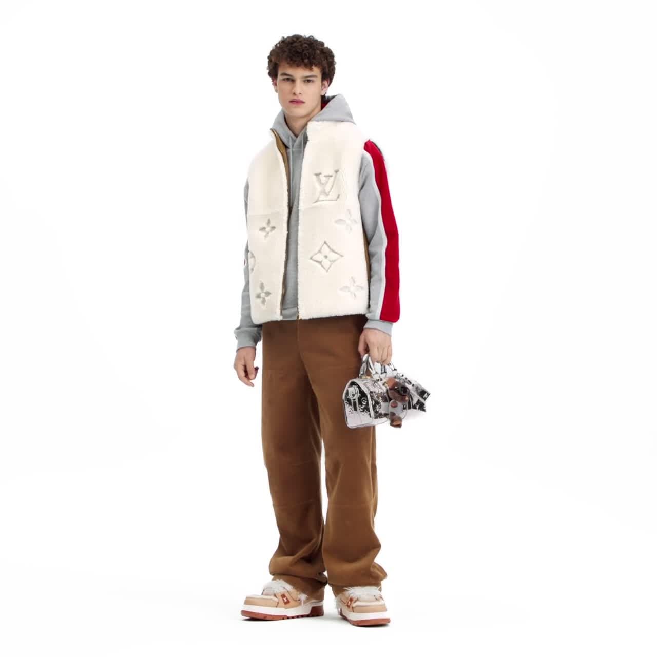 هذه السترة البيضاء القابلة للارتداء على الوجهين مصنوعة من فرو الشيرلينغ، وهي طبقة ناعمة ودافئة وفاخرة بدون أكمام يمكن تنسيقها بعدة طرق. ويزدان الجانب المصنوع من فرو الشيرلينغ بنقشة Monogram كبيرة الحجم، وتأتي السترة بلمسة نهائية بتطريز بتأثير محبوك. ويزدان الوجه الآخر من الموديل المستوحى من ملابس العمل والمصنوع من قماش الكانفاس والكوردروي بحلية معدنية على شكل شعار LV على الصدر ومسامير مزخرفة بزهور Monogram وشارات تحمل شعار العلامة من الجلد بلون الجلد الطبيعي.