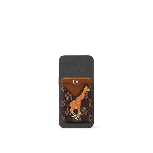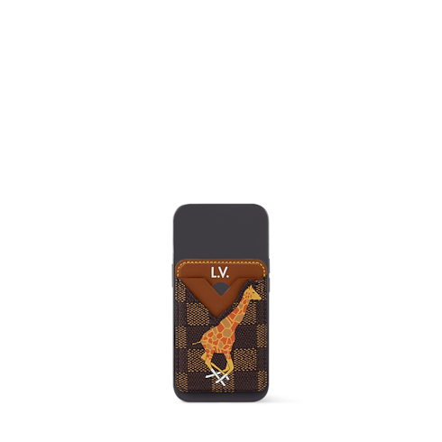 مصنوع من قماش Damier Heritage المطلي وجلد بني فاتح، يتميز حامل بطاقات المغناطيس بتصميم مخصص يحمل طبعة زرافة تركض، احتفاءً من الدار بفيلم The Darjeeling Limited. يمكن تثبيت هذه الحافظة على أي جهاز iPhone متوافق مع MagSafe، وتضم فتحتين على شكل حرف V لحفظ البطاقات بأناقة.