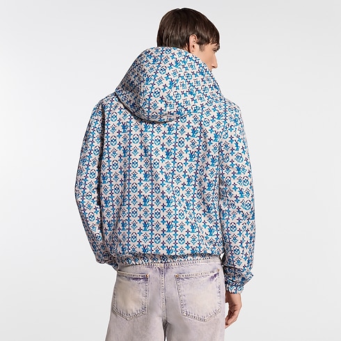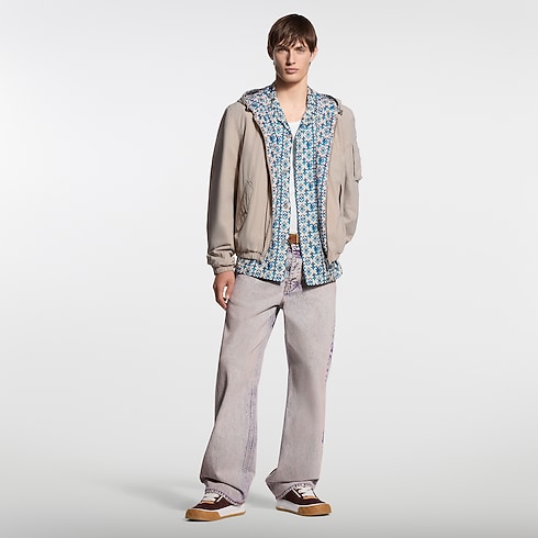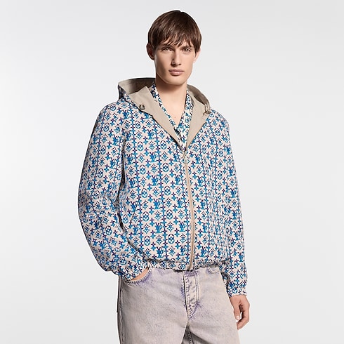 يتميز هذا الجاكيت الواقي من الرياح والقابل للارتداء على الوجهين بوجه خارجي بلون بيج خالد يسهل تنسيقه، بينما يزدان الصدر بتطريز لتوقيع يحمل بصمة الدار بنفس درجة اللون. وعند ارتدائه على الوجه الآخر، تبرز عليه نقشة Monogram Overlap الغرافيكية الخاصة بعرض ربيع وصيف 2026، وهي بدرجات اللونين الفيروزي والأرجواني الزاهية، ومستوحاة من التراث الحرفي في الهند. يمكن تنسيق هذه القطعة التقنية ومتعددة الاستخدامات بطرق متنوعة.