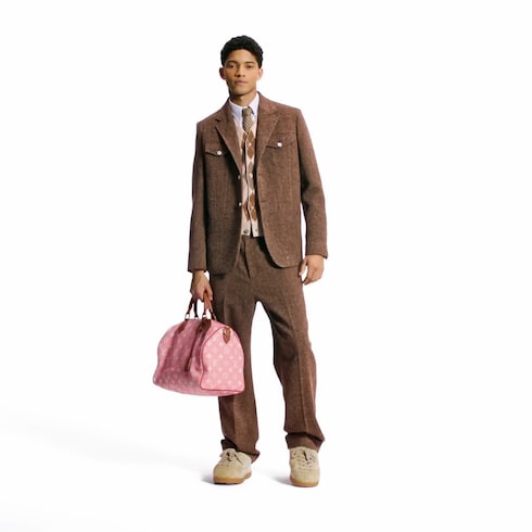 صُنع هذا الجاكيت العملي المفصل من تويد منقط بدرجات بنيّة غنية بنمط متعرج، ويزدان بتفاصيل دقيقة راقية، ويتميز بصف واحد من الأزرار على شكل لآلئ رائعة. ويمزج هذا التصميم بين الفخامة الكلاسيكية والأناقة العصرية، حيث يتضمن عناصر مستوحاة من الدنيم، مثل الجيوب بغطاء متدلي على الصدر وتقليمات على شكل الحرف ‘V’ مستوحاة من سترات سائقي الشاحنات. وتكتمل الإطلالة الراقية المميزة ببنطال برباط مطابق.