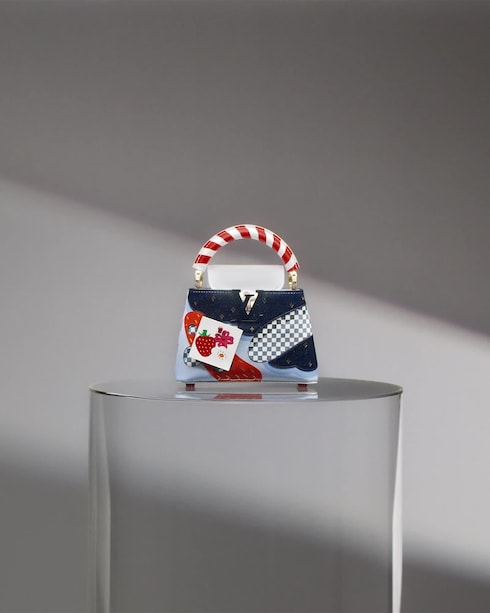 تم تزيين السطح الأملس لحقيبة Capucines، بزخارف غريبة، بطبقات من الجلد اللامع باللون الأزرق الداكن في خليط نابض بالحياة من الأنسجة والألوان، لتحويل الحقيبة الأيقونية إلى قطعة حلوى - تكتمل بمقبض قصب الحلوى. "لقد انبهرت للغاية بالتفاصيل التي تم تحقيقها في هذه الحقيبة: من أقدام حلوى النعناع المصنوعة من الراتنج إلى رجل خبز الزنجبيل المطلي بالمينا الذي يحتوي على أزرار LV Monogram على شكل زهرة." - زيبينج وانج