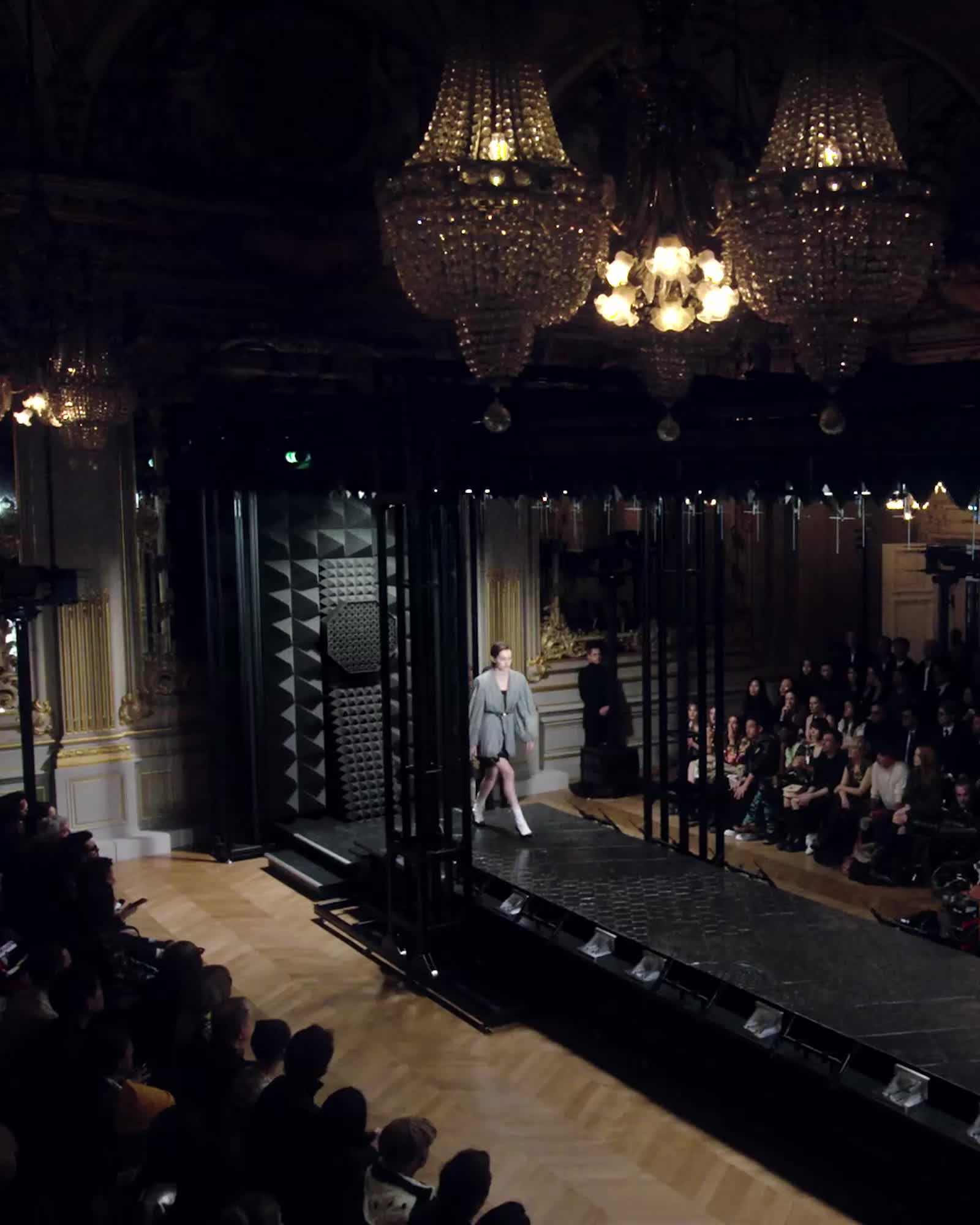 The Fall-Winter 2023 Collection was presented in the Musée d’Orsay. Nicolas Ghesquière collaborated with leading French artist Philippe Parreno and sound designer Nicolas Becker to imagine an immersive set. Featuring geometric lines, a Parisian street, and a curated sound experience, the design brought Paris to life. Live amplified sounds of the models’ heartbeats and footsteps were spliced with sounds of the city, creating a dialogue between the show and its surroundings.