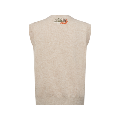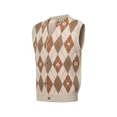 This preppy cardigan vest is crafted from fine baby merino wool in seasonal beige and brown tones. It is adorned on the front with a graphic Argyle intarsia motif incorporating delicate LV signatures and embroidered Monogram Flowers. Mount Fuji embroidery at the back recalls this collection’s creative collaboration between Pharrell and Nigo.