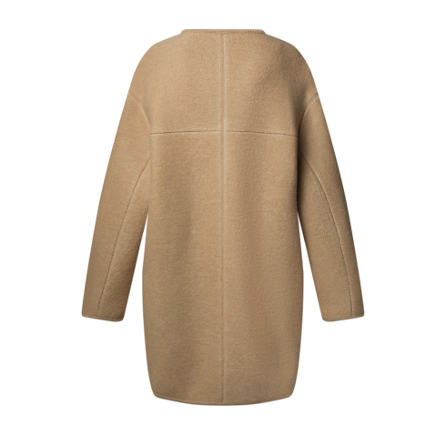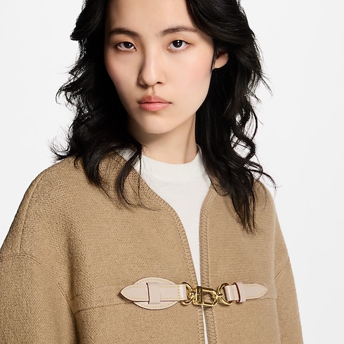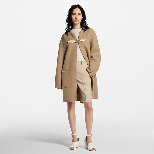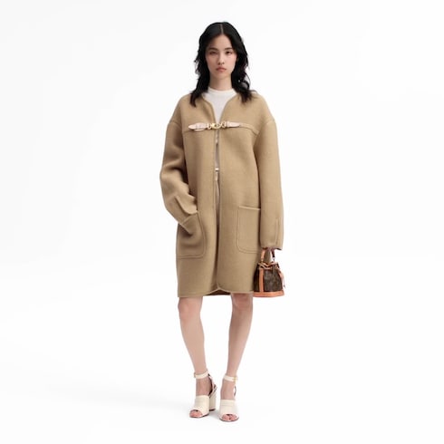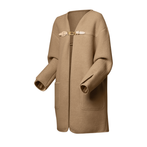 This coat is crafted from elegant wool bouclette in a timeless shade finished with tone-on-tone piping for cozy yet elevated styling. It is cut in a long, boxy shape with a clean neckline and two large patch pockets, while a metallic carabiner clip trimmed with contrasting leather details adds a modern fastening to the front.