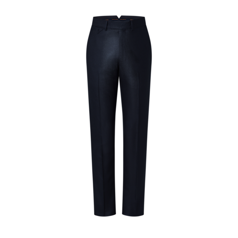 This elegant suit offers a timeless formal silhouette for the office. It is crafted from a luxurious cashmere blend twill in dark navy with a soft luster. The single-breasted Pont Neuf jacket has a smart peak lapel and LV stitching on the top button, while the cigarette pants are discretely signed with an embroidered LV on a triangular tab on the right hip. With its versatile color, this suit is easy to layer and accessorize.