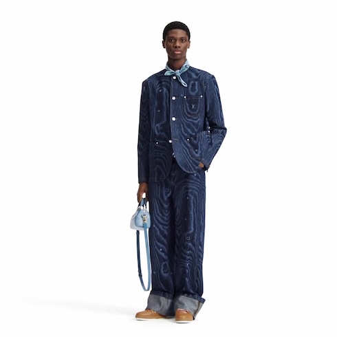 The iconic collarless tailored jacket is revisited in indigo denim, elevated with this collection’s graphic LV Moiré motif. Subtly interpreted in a tonal print incorporating discreet Monogram signatures, it creates a playful illusion of shimmering silk. Signed with a nubuck Marque L.Vuitton Déposée label on the back, this elegant piece has matching denim pants for a contemporary look.