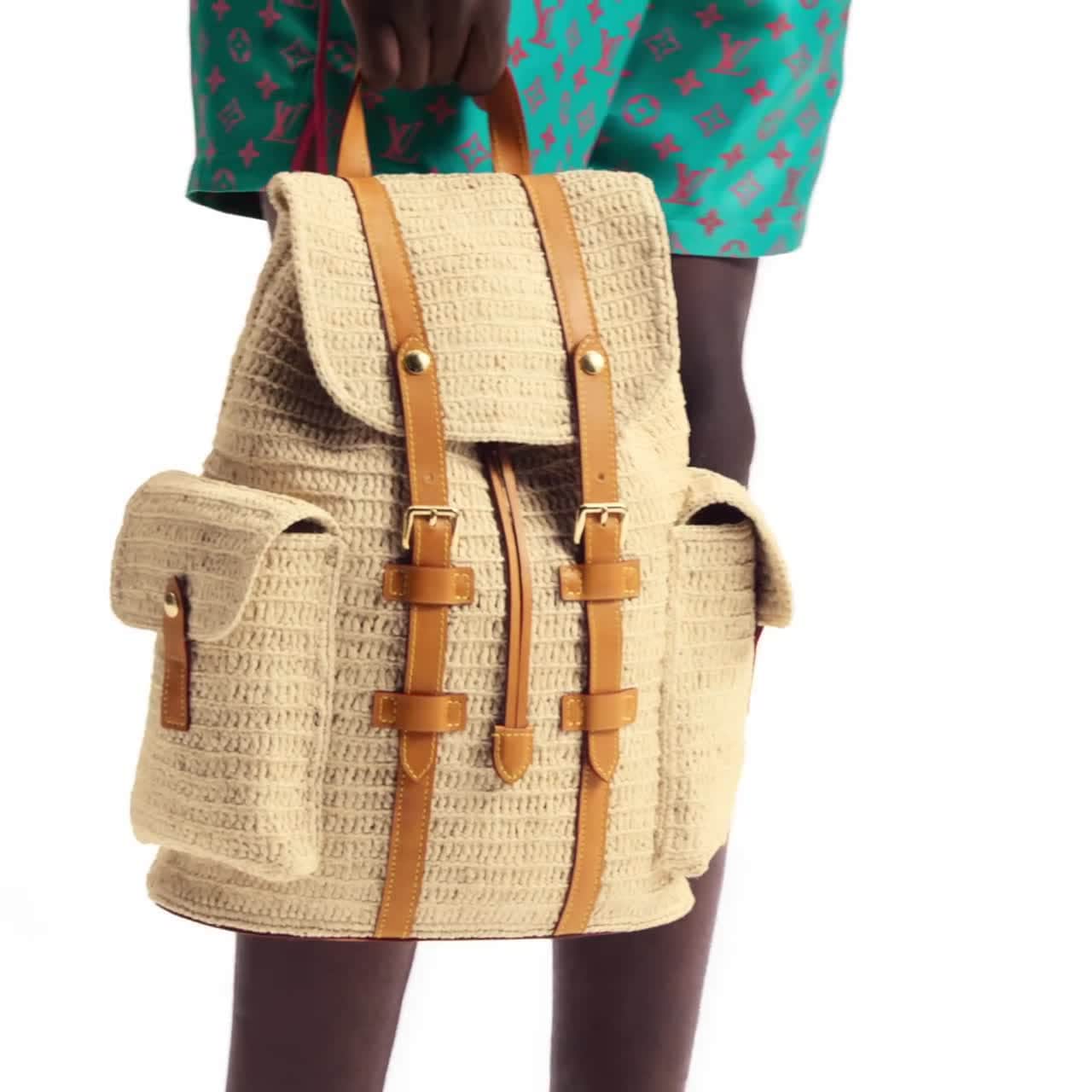 The Christopher PM backpack in raffia showcases the House’s expertise, as the delicate fibers are complex to shape into the distinctive Christopher design. Made from raffia, handcrafted making each bag unique. The two side pockets, combined with the natural leather trim, gives this Christopher a summery feel.