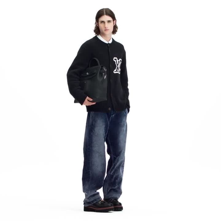 This contemporary collarless cardigan is crafted from chunky black yarn with a cozy hand-knitted effect, delivering laid-back style for effortless weekends. A contrasting LV is incorporated directly into the soft virgin wool-blend knit, lending a graphic accent to the chest. This piece makes a versatile layering option for the colder months.
