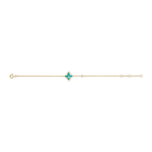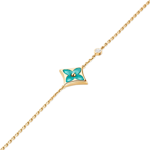 The Color Blossom pieces celebrate the emblematic Monogram Flower, designed in 1896 by Georges-Louis Vuitton, son of the founder. Set into 18-karat yellow gold, this precious bracelet features a Star motif carved from amazonite, hand-polished to a high gloss and accented by a brilliant round diamond on the chain. Months of work were necessary to perfect the stone’s subtle curves and sparkle. This delicate bracelet is an invitation to stack, mix or match with other models from the collection.