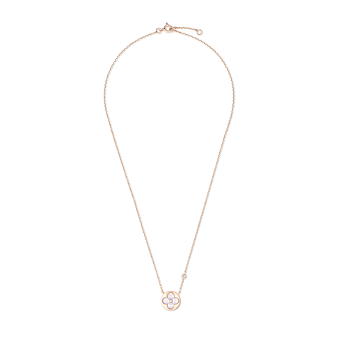 The Color Blossom pieces celebrate the emblematic Monogram Flower, designed in 1896 by Georges-Louis Vuitton, son of the founder. Set into 18-karat pink gold, this precious pendant features a Sun motif carved from white mother-of-pearl, hand-polished to a high gloss and accented by a brilliant round diamond on the chain. Months of work were necessary to perfect the stone’s subtle curves and sparkle. This delicate pendant is an invitation to stack, mix or match with other models from the collection.