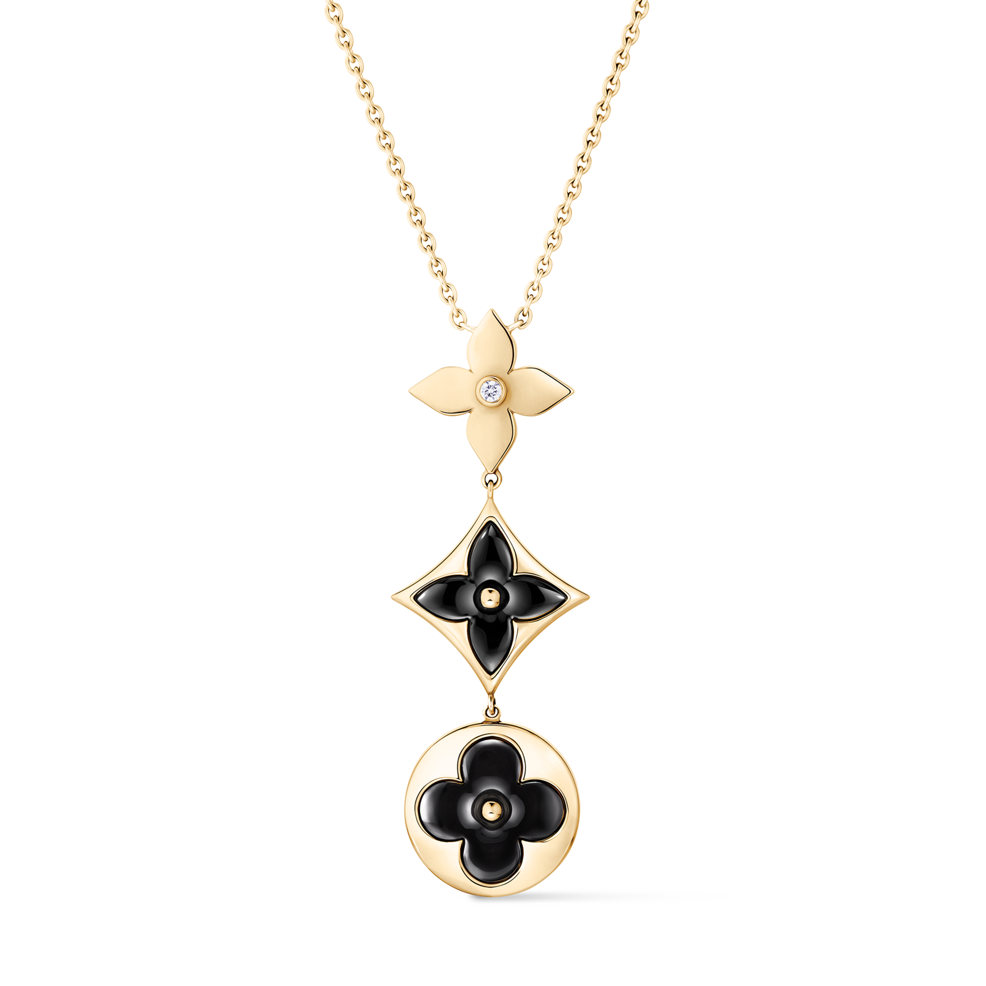 With this necklace, Colour Blossom celebrates the Monogram Flower, created in 1896 by Georges-Louis Vuitton. The pendant's trio of signature motifs is cast from 18-karat yellow gold. One is set with a sparkling diamond, while two are meticulously carved from black onyx. This is a beautiful piece to layer, mix or match with other jewels from the collection.
