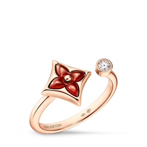 This Colour Blossom Mini Star Ring is made from 18-karat pink gold, set with a red-hued cornelian accented by a brilliant diamond. The cornelian is finely carved and polished by House craftsmen to produce a softly glowing, dimensional surface. The ring’s refined mini size lends itself to mix-and-match styling for a chic, modern look.