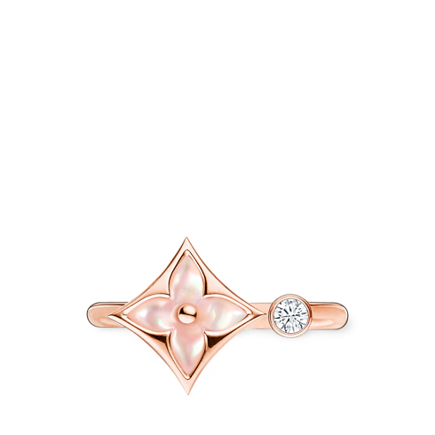 This Colour Blossom Mini Star Ring is cast from 18-karat pink gold, set with a pink mother-of-pearl motif and a brilliant accent diamond. The mother-of-pearl is finely carved and polished to produce a softly glowing, dimensional surface. The ring’s refined mini size lends itself to mix-and-match styling for a chic, modern look.
