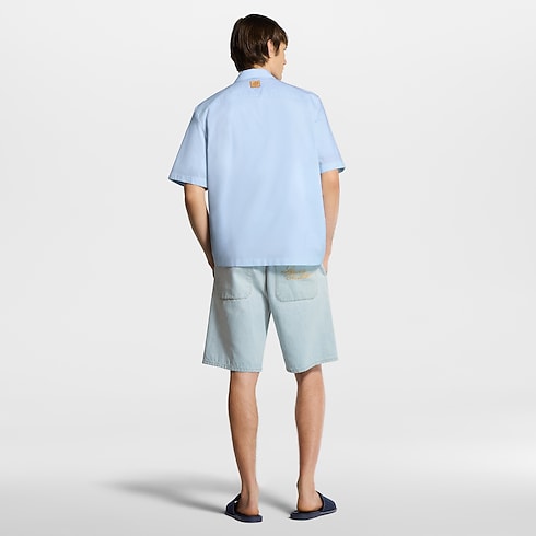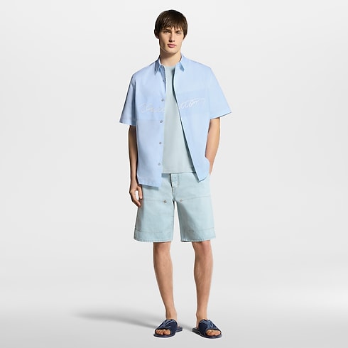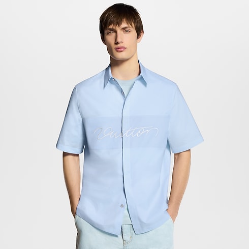 This summery short-sleeved cotton shirt comes in a light blue miniature gingham check. A concealed button placket creates a clean, minimalist silhouette, which sets off a contrasting insert with a meticulously embroidered cursive Vuitton signature across the chest. This fresh and graphic piece brings a fashion-forward accent to casual and everyday looks.
