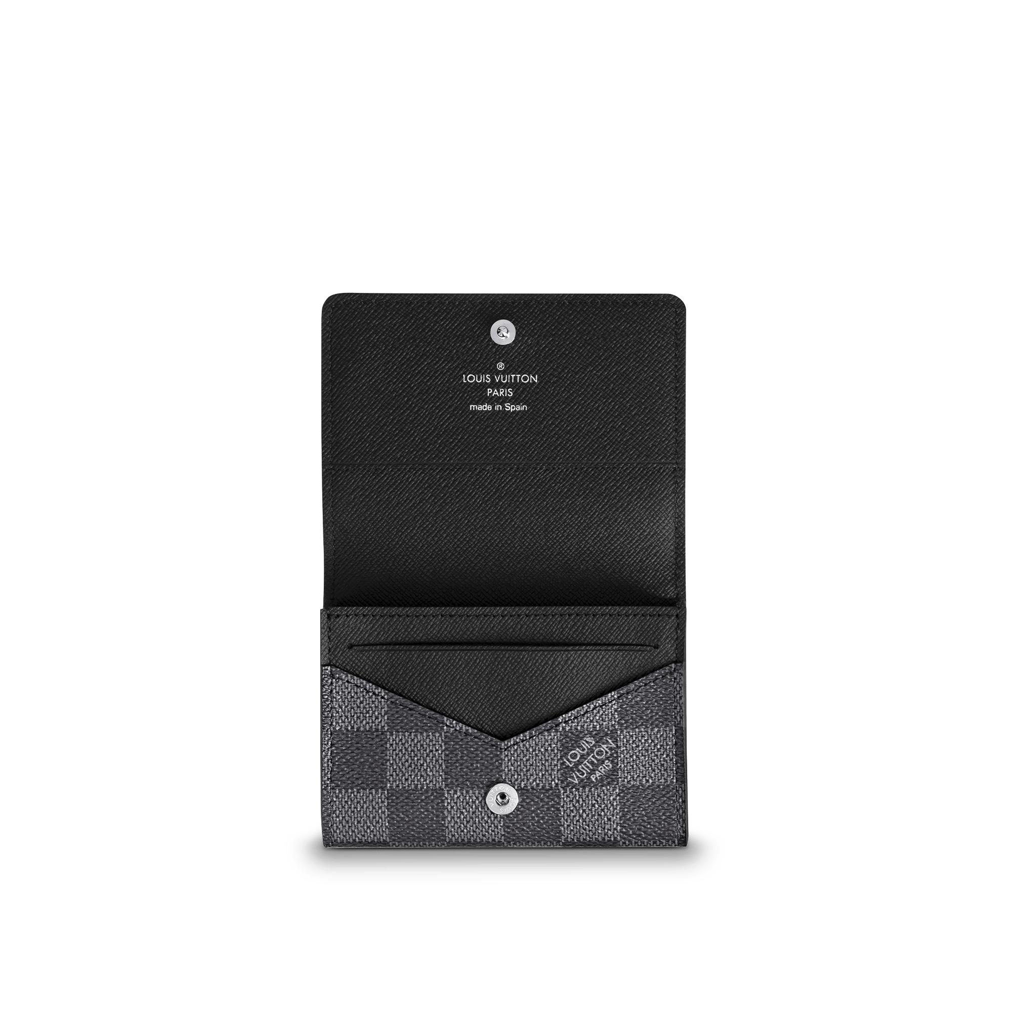 In Damier Graphite coated canvas, the slim and refined Enveloppe Carte de Visite slips effortlessly into any pocket or bag. Its press-stud closure ensures that your business or credit cards stay safe.