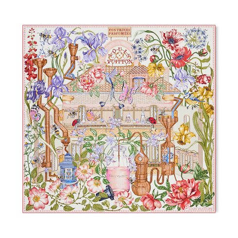 The all-silk Fontaines Parfumées square captures the essence of Louis Vuitton in an intricate design inspired by the art of fragrance. Its colorful pattern depicts a vintage-style perfume extractor surrounded by delicate flowers, with the House’s perfumery atelier in the background. An elegant, feminine accessory, infused with the harmony of craftsmanship and nature.
