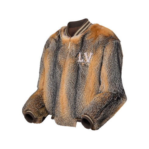 This sophisticated bomber jacket elevates a casual silhouette with deep Virginia fox fur in elegantly graduated tones. A rhinestone-encrusted silver metal LV brooch embellishes the chest, while the zip closure adds a dandy twist with a pearl-ornamented puller. Striped ribbing trims the collar, cuffs and hem, lending a sporty, modern vibe to this exclusive piece.