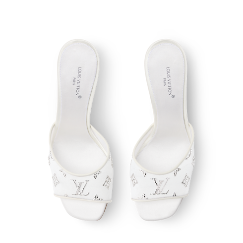For the Louis Vuitton Bridal capsule, the Gala mule is interpreted in translucent mesh and shimmering rhinestones, intricately arranged to form the Monogram pattern. This timelessly feminine style has a wide, curved front strap and a slender stiletto heel. It is finished with a leather outsole, which is signed with an LV Initials accessory.