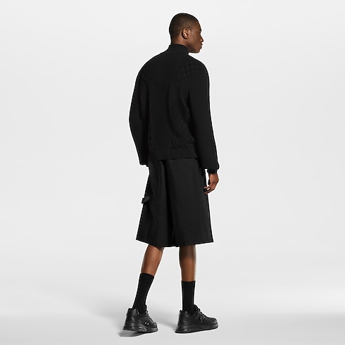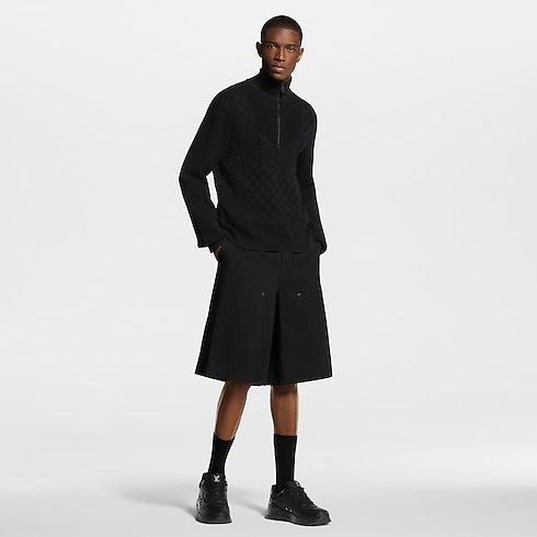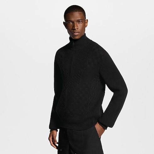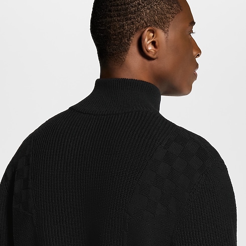 This knitted black half-zip pullover is distinguished with a play of stitches creating sporty intarsia panels with a textured finish. A Damier motif embellishes the body, while a tone-on-tone LV is embroidered above the left hem. This versatile technical cotton knit can be styled with this collection’s other black separates for a bold and urban silhouette.