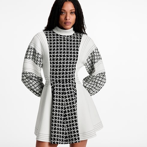 This statement dress from the runway draws on medieval silhouettes with voluminous balloon sleeves and a fluid A-line skirt finished with a standing collar and structured cuffs. Crafted from viscose-wool jersey, graphic flashes of this season’s two-tone honeycomb jacquard are offset by contrasting panels detailed with topstitching for a sporty finish.