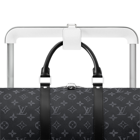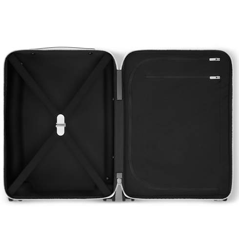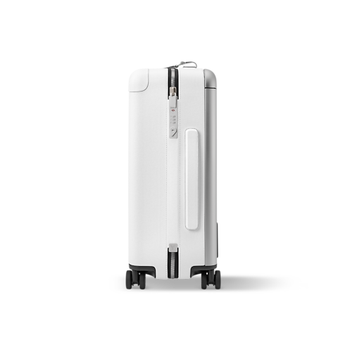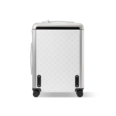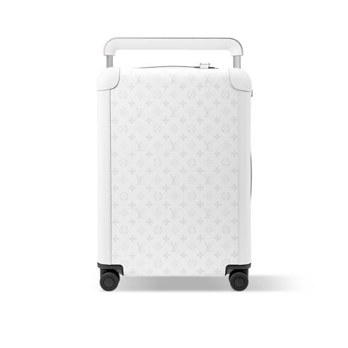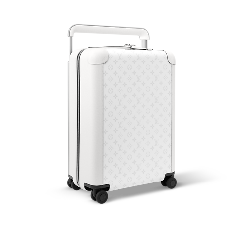The Horizon 55 rolling suitcase combines white Monogram coated canvas with Taiga cowhide leather for a refined monochromatic look. Its exterior cane design maximizes space, revealing an interior with elastic straps and a zipped divider. Four compact wheels and a wide cane handle make this cabin-sized piece effortlessly easy to maneuver.