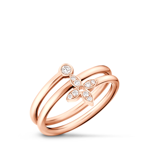 The Idylle Blossom Multi ring combines an instantly identifiable Louis Vuitton icon with a creative spiral design. Styled in pink gold accented with nine radiant diamonds, it harmonizes a star-shaped Monogram Flower with a finely crafted circle, a symbol of perpetual movement and infinity. Fresh and feminine, this exceptional ring adds a delicate touch of refinement to an everyday or evening look.