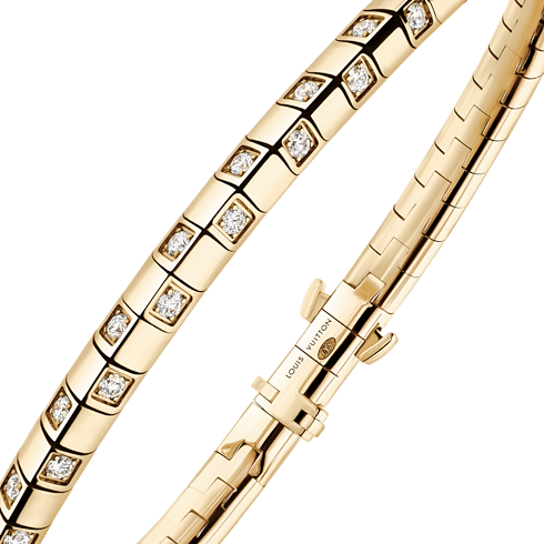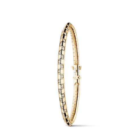 The graphic genderless style of Le Damier de Louis Vuitton bracelet makes it a unique combination of contemporary artistry and classic heritage. Delicately crafted in hand-polished 18-karat yellow gold set with radiant diamonds, its design evokes the House’s iconic Damier motif, a timeless symbol of infinity created by Louis and Georges-Louis Vuitton in 1888. Designed to be combined with other jewels, this exceptional bracelet is meant to be worn every day – and never taken off, becoming an authentic second skin.