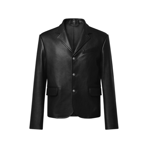 This sleek black leather jacket is both timeless and contemporary. Tailored from fine bull leather, the single-breasted style makes a versatile silhouette for styling with both casual and formal looks. This piece is signed with a leather Marque L.Vuitton Déposée patch on the back, and can be paired with matching leather pants for a moody modern twist on the suit.