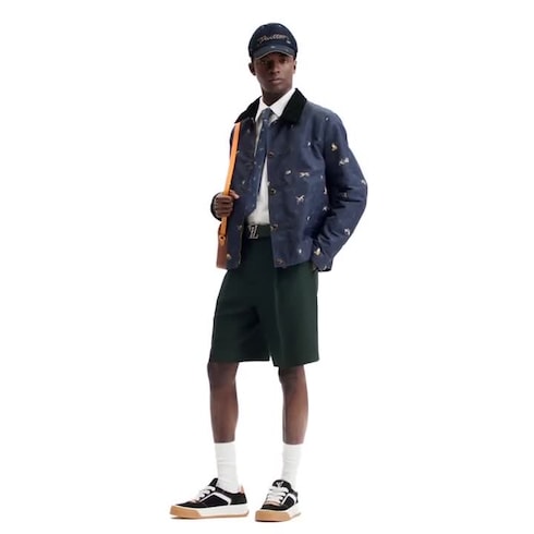 Crafted in navy blue technical fabric, this elegant padded jacket draws on British outdoor traditions with its soft corduroy collar and warm quilted lining. It features an allover LV Blason print, playfully enriched with animal depictions, including dogs, foxes and rabbits, that enhance the British countryside mood of this versatile transeasonal piece.