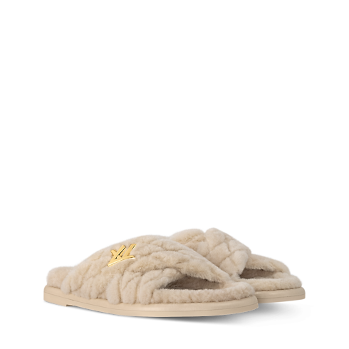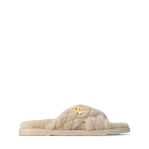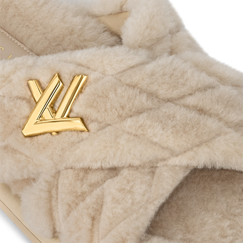 This luxurious iteration of the LV Bliss comfort mule comes in fluffy shearling. In a refined touch, its cross-over straps are embroidered with the heritage Malletage pattern, inspired by the lining of Louis Vuitton trunks. A gold-tone LV Twist accessory signs this on-trend, easy-to-wear style, which is finished with a lightweight rubber outsole.