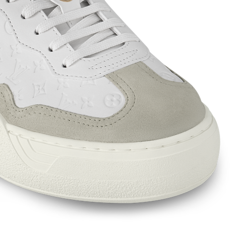 The LV Groovy platform sneaker comes in soft calf leather, which is debossed with Louis Vuitton's iconic Monogram pattern. This model combines a Seventies-inspired upper with an oversized, elevated outsole. Key details include the Monogram Flower lace accessory, the natural leather trim at the back, and the specially designed Louis Vuitton signature on the tongue.