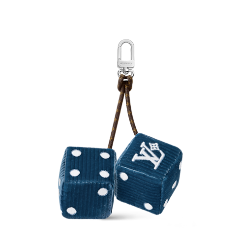 The LV Lucky Dice charm makes a lighthearted gift that is luxurious in its fluffy texture. Constructed from an evocative blue velvet, a pair of the game board staple boasts embroidered white dots plus an LV Flower signature on its sides. The dice dangle from a monogram cord.