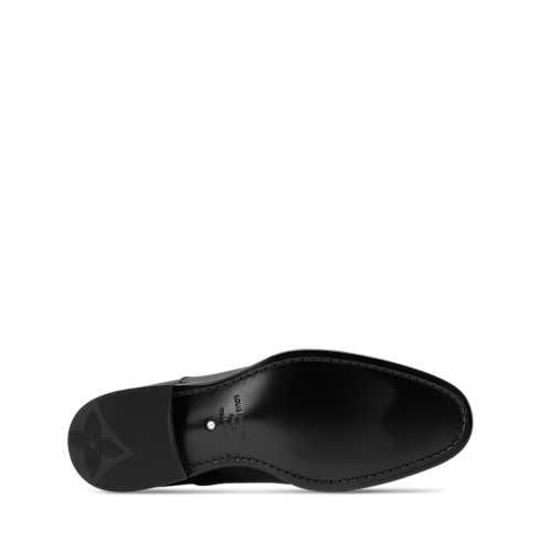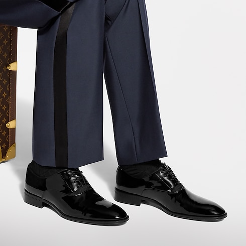 The LV Premiere Oxford lace-up in patent calf leather evokes the refined spirit of English gentlemen, revisited by Men's Creative Director Pharrell Williams. Its sleek lines are complemented by elevated details, including an embroidered signature on the laces. This model is finished with a slightly higher than usual heel and a leather outsole decorated with Pharrell Williams' signature pearl.