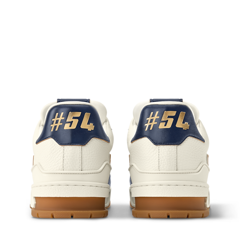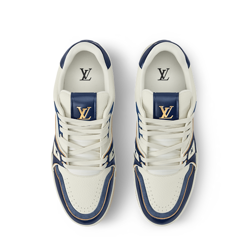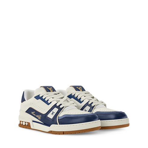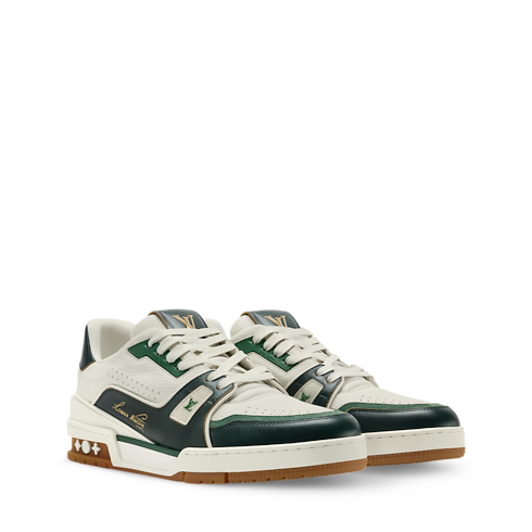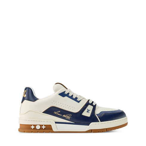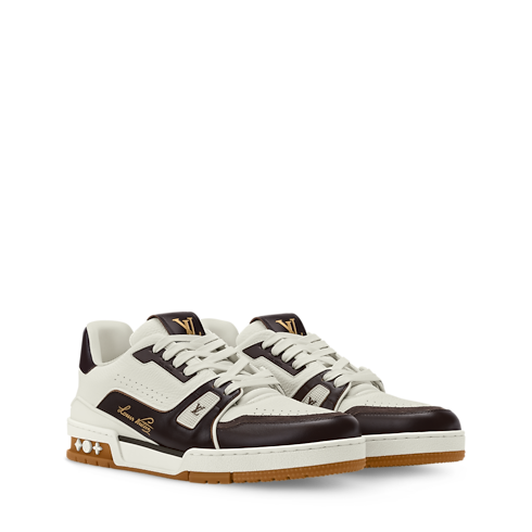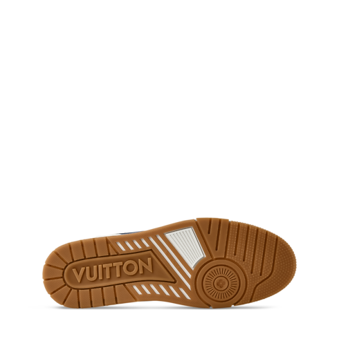 This refined interpretation of the LV Trainer sneaker combines grained and aged calf leather, fusing vintage-style materials with a contemporary design. This iconic model, which was inspired by classic basketball sneakers, is notable for its elaborately constructed upper, which features multiple House signatures, and its technical rubber outsole with Monogram Flowers.