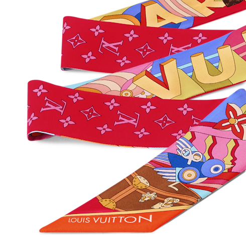 The all-silk LV Wonderland BB bandeau is a colorful ode to creativity and craftsmanship. Its eye-catching pattern depicts a whimsical futuristic landscape accented with Monogram Flowers and iconic Louis Vuitton luggage creations. Outsized letters with a striking 3D effect spell out the House’s name, adding an original signature to this elegant contemporary accessory.