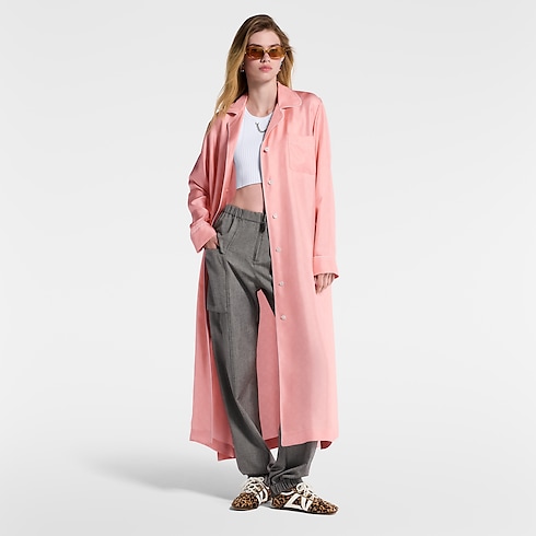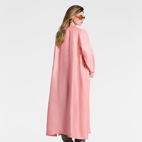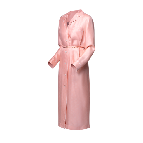 This button-front shirt dress elegantly echoes the House’s signature pajamas in lustrous silk twill which is subtly signed all over with a delicate Mahina Monogram motif. The neckline is highlighted with a notched lapel collar, while a chest pocket and tonal piping underscore the refined loungewear look and a slim belt adds definition to the waistline.
