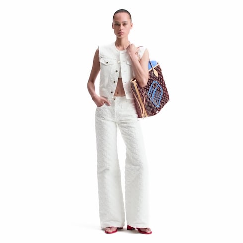 A textured, tone-on-tone Monogram fil coupé signature uplifts these jeans with a fresh, summery spirit, while plain inserts add a subtle contrast to the pockets and back. They are cut from structured cotton in a flattering high-waisted boot-cut shape, complete with chic golden hardware and an oversized leather belt loop.